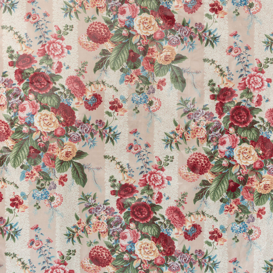 From the Ramm archive- a full- blown floral chintz- uncompromising in colour & scale- transcribed from an original work by Jean Ulric Tournier from 1855. The essence of what Ramm was known for; the Ruby & Russets colourways with no apology for the boldness or mix of colours; the Earl Grey more restrained. Pure joy & unashamedly English- the flowers straight from an English herbaceous border in full bloom offset by the delicacy of the intricate background stripe- superb!
